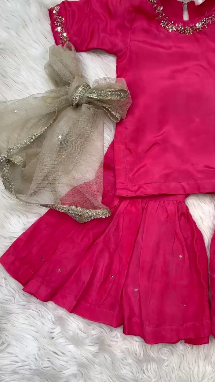 - β¨ Elegant Rani Pink ethnic set with kurti, gharara, and dupatta.